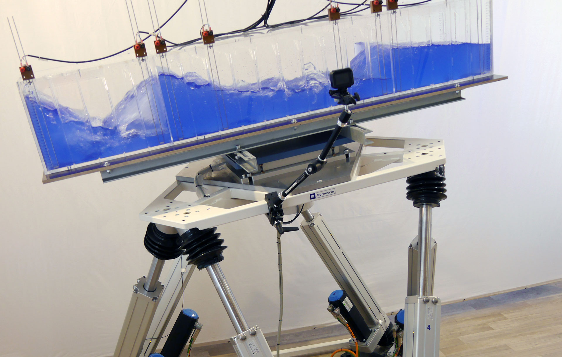 Symétrie realizes a wide range of motion generators for wave basins using the hexapod technology. Thanks to our metrology background, the choice of this technology is even more important that it allows very real simulation with accurate trajectories in the 6 degrees of freedom.
